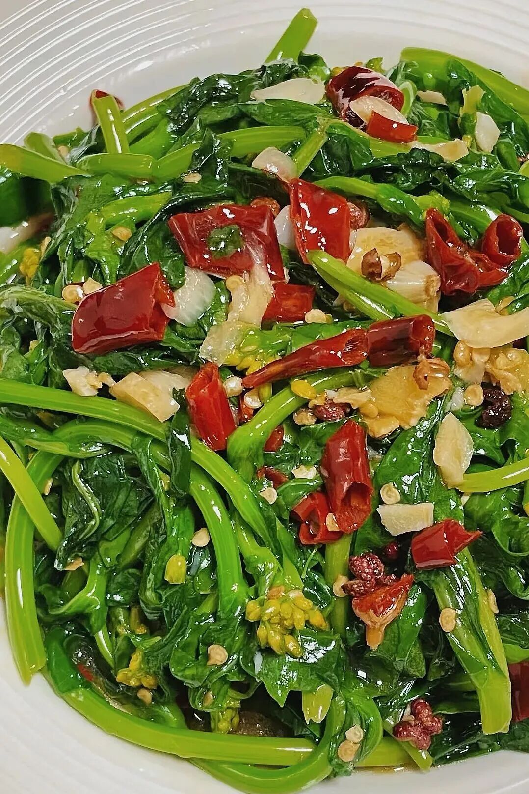 蒜瓣拍碎,干辣椒切段,热油爆香后倒入油菜花大火快炒,只需一点盐,那股清甜便从舌尖蔓延到心底。