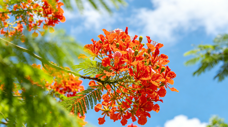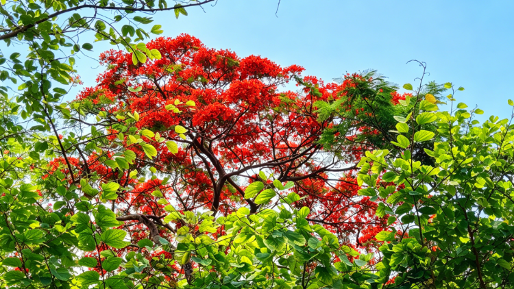 凤凰木的枝头,不知何时冒出了几簇猩红。像信使提前点亮的灯笼,像夏天偷偷探出的触角。