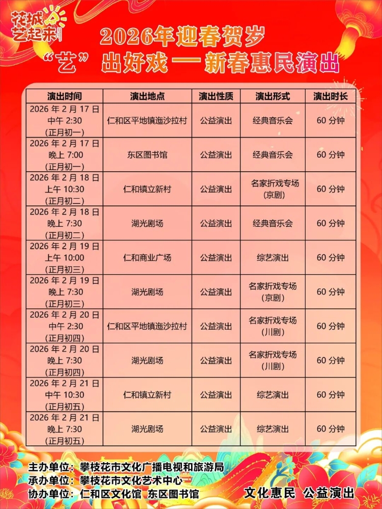 从旅游景区到剧场舞台,从喧嚣广场到社区街道,多场高品质演出陪伴市民与游客欢度佳节,让文艺节目与新春年味相融,为钢城献上一场场有温度、有韵味的文化盛宴。这个春节,攀枝花市文化艺术中心以文艺为媒、以惠民传情,用一场场精彩演出,点亮新春文化年味。