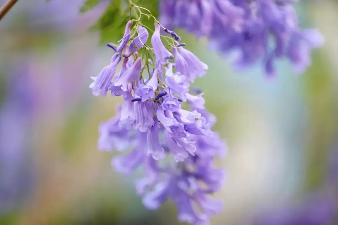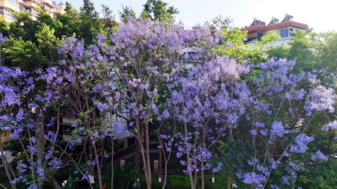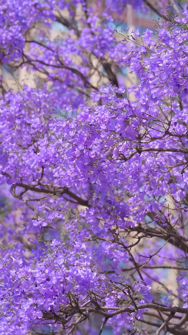 当整条街的蓝花楹同时盛放,树冠相接,花朵连成一片,仿佛天空被染上了梦的颜色。