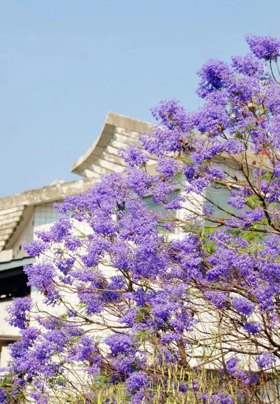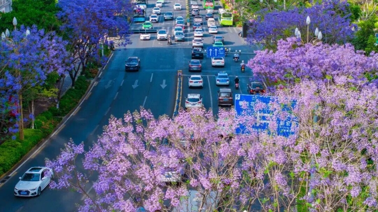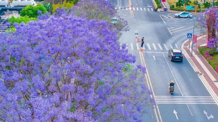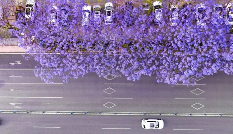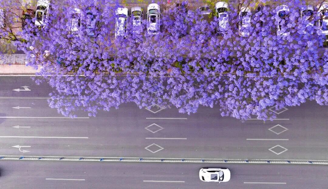 也许是在某个寻常的清晨,阳光刚刚漫过楼宇,你推开窗,发现楼下的街道已被染成一片蓝紫色的雾。