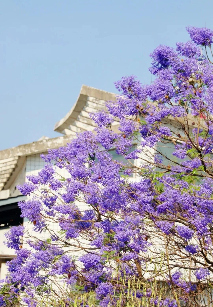 米色、浅杏色能很好地融入氛围;若是想复古一些,可以试试深蓝色,与蓝花楹形成层次感。