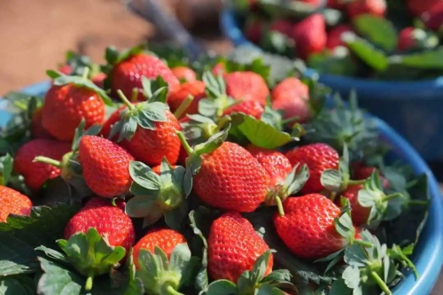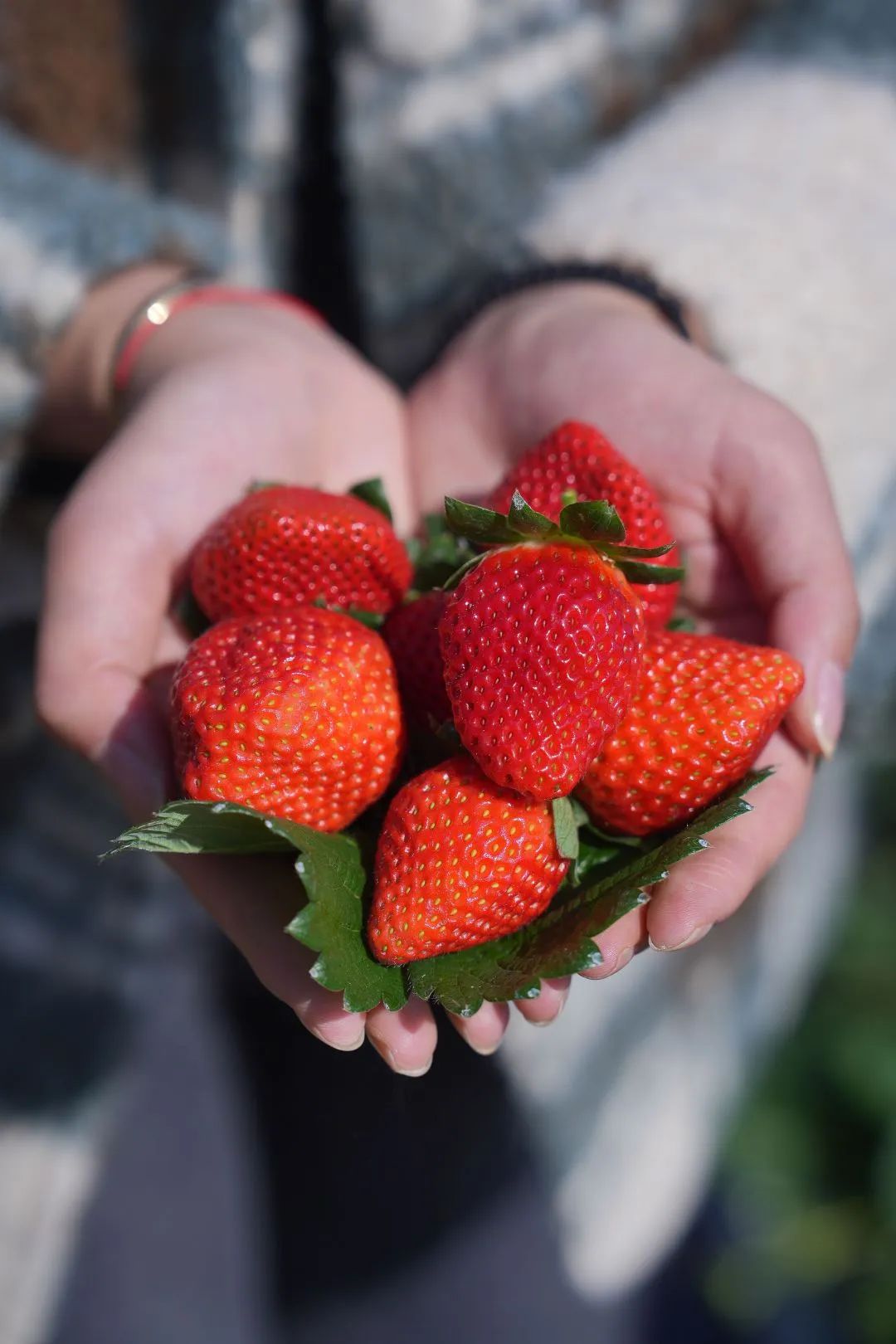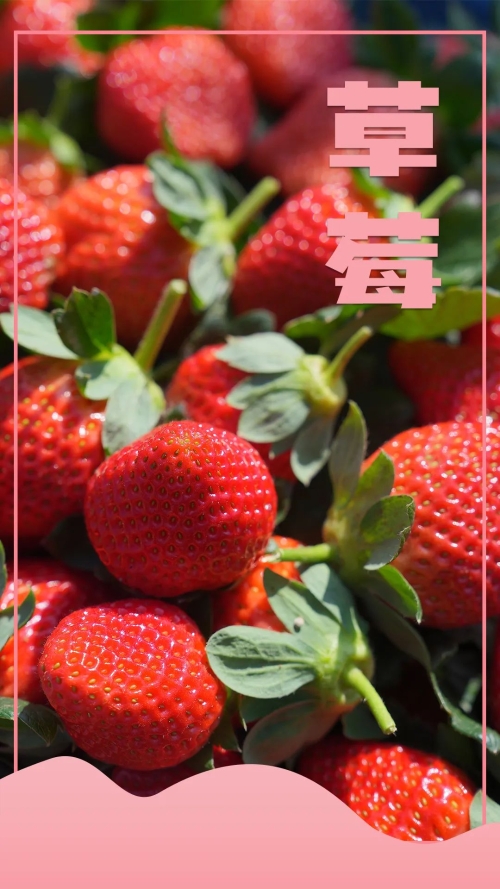 一颗颗鲜艳欲滴的草莓在绿叶中若隐若现
