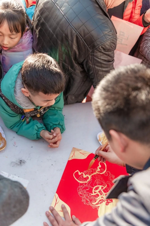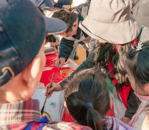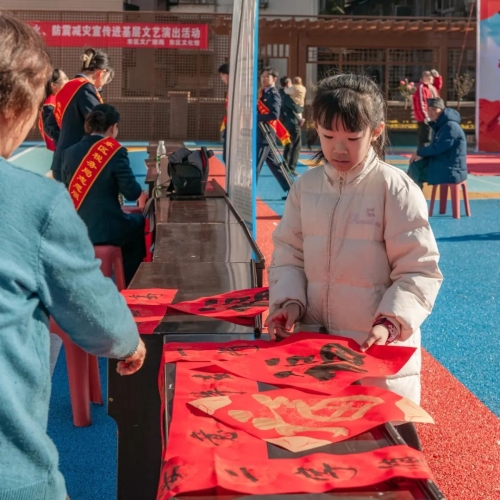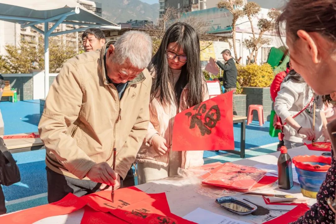 攀枝花市文化馆美术书法干部、党员代表及文旅志愿者,挂红巾,挥笔墨,再次为广大居民群众送“福”、写春联、送剪纸窗花、送金龙、送年画日历。