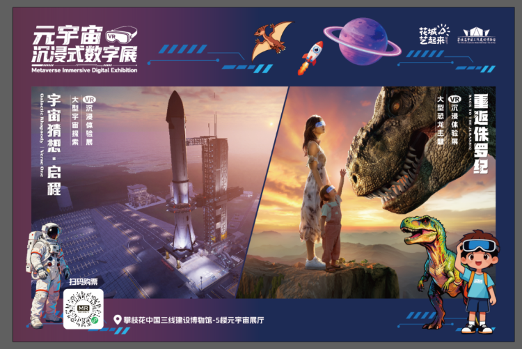 国庆节首次推出2个主题:宇宙猜想启程、丛林探秘重返侏罗纪。(温馨提示:元宇宙VR沉浸数字展为非免费体验项目)