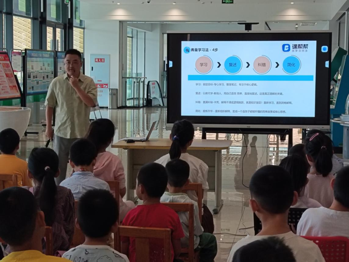 活动中,课帮帮AI一站式学习体验中心邀请讲师张建勇通过图文并茂的课件、互动问答的方式,围绕费曼学习法进行了讲解,即:学习、复述、纠错、简化,并以英语单词和圆周率作例子,现场邀请小读者作为志愿者学习记忆方法后向在座的大家讲解该如何快速轻松地记忆并分辨难点。随后,小读者们分为不同年龄段组别使用课帮帮AI一站式学习体验中心提供的AI学习机进行体验和开展PK竞赛,现场气氛紧张而热烈。