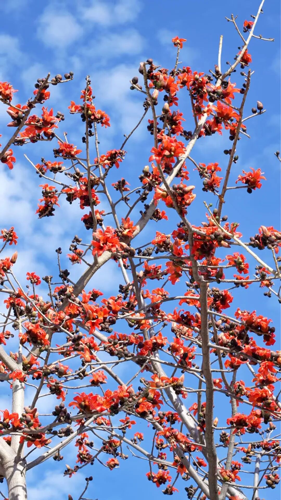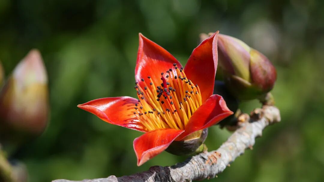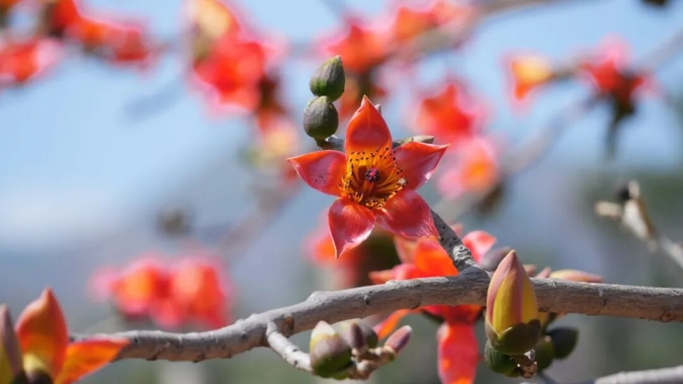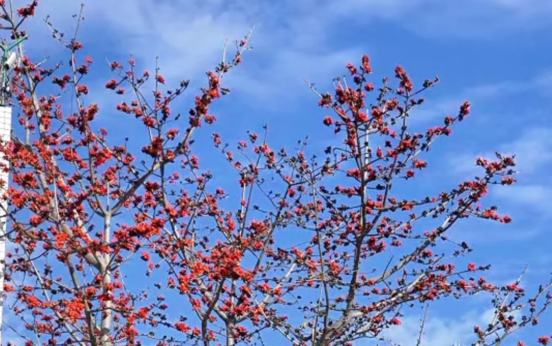 炳草岗的街旁,金沙江的江畔,甚至是老小区的围墙边,那些高大的木棉树,一夜之间就把花骨朵儿撑成了小喇叭。