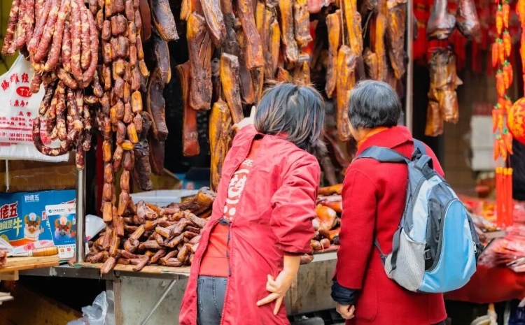 灌香肠的机器嗡嗡作响,老板一边手上不停,一边和熟客摆着龙门阵:“还是要麻辣的嗦?”