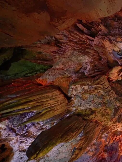 钟乳石千姿百态:有的像瀑布倾泻,有的像佛手合十,还有一根粗壮的“定海神针”从洞顶直插到底。
